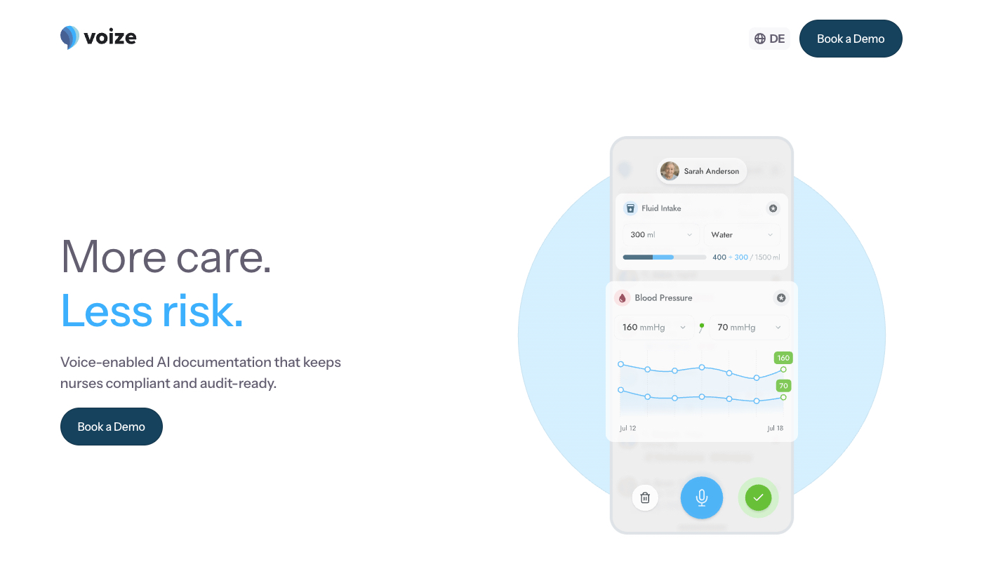 - Workflow Automation: voize listens as nurses speak during care, understands their notes, and handles admin like documentation and scheduling in real time.